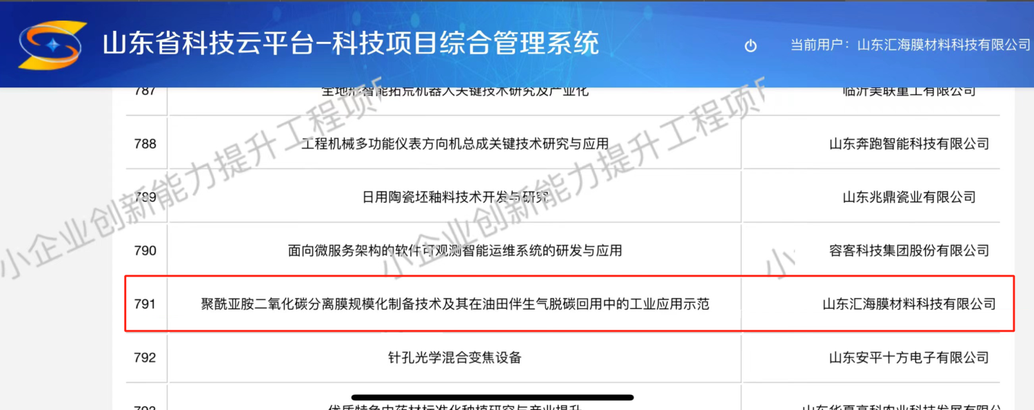 近日,省科技廳公示了2023年山東省科技型中小企業創新能力提升工程(第批)擬立項項目名單,匯海膜材料研發的“基于聚酰亞胺二氧化碳分離膜規模化制備技術及其在油田伴生氣脫碳回用中的工業應用示范”項目成功入選2023年山東省科技型中小企業創新能力提升工程。