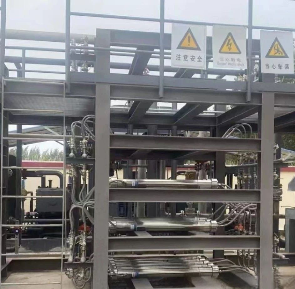 采用中空纖維膜法分離對天然氣中的CO2實現分離。中空纖維膜法分離是一種新興的高效綠色分離技術,它利用不同氣體組分在壓差驅動下透過膜的速率差異實現分離。對于天然氣分離CO2過程,膜法分離過程不發生相變,無化學反應具有能耗低、操作簡單、設備占地面積小等優點,解決國外“卡脖子”技術。中石油CCUS示范區塊因長期注入CO2實現驅油目的的同時導致該區塊伴生氣中CO2含量急劇增高,一旦CO2碳含量超標將無法外銷,暫無其他去向,分離后的伴生氣只能放空,存在巨大的安全風險,通過中空纖維膜法分離技術,實現對油田伴生氣中CO2有效分離,解決油田伴生氣去向。